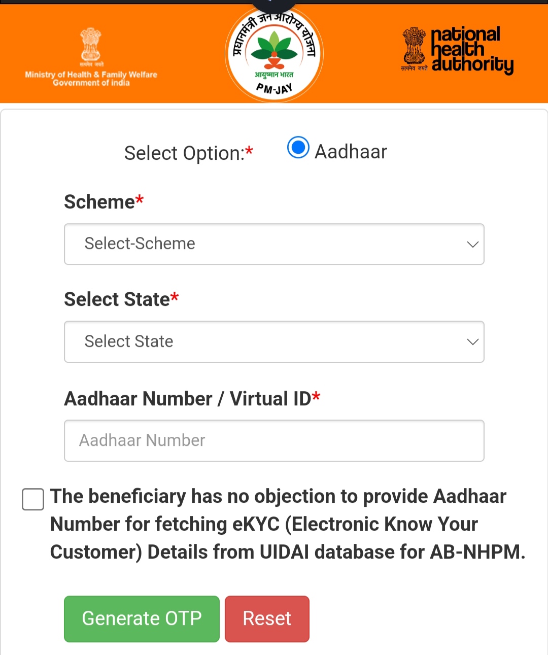 - https://bis.pmjay.gov.in/BIS/selfprintCard या वेबसाईटवर जाऊन आधार कार्ड ऑप्शन निवडा