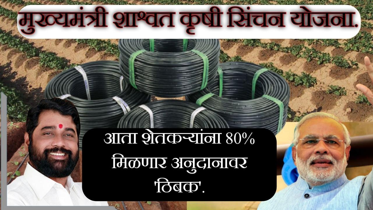 मुख्यमंत्री शास्वत कृषी सिंचन योजना ही महाराष्ट्र सरकारने शेतकऱ्यांना सर्वसमावेशक सिंचन सुविधा उपलब्ध करून देण्यासाठी सुरू केलेली योजना आहे. वेळेवर आणि पुरेसा पाणीपुरवठा करून शेतजमिनीची उत्पादकता वाढवणे हा या योजनेचा उद्देश आहे. या योजनेमध्ये आपल्याला १ लाख रुपयांचे ठिबक अनुदाना अंतर्गत फक्त २० हजार रुपयात मिळेल. या लेखात, आम्ही योजनेची ठळक वैशिष्ट्ये आणि फायदे अधोरेखित करून तपशीलवार चर्चा करू.
