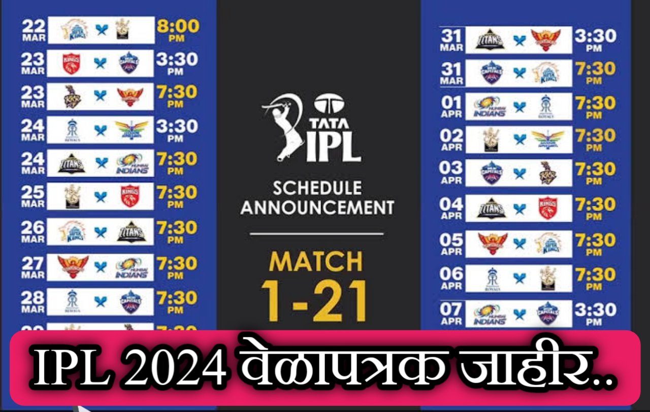 22 मार्च पासून सुरु होणाऱ्या आयपीएल 2024 च्या पहिल्या 21 सामन्यांचे वेळापत्रक बीसीसीआय ने नुकतेच जाहीर केले आहे. यात चेन्नई सुपर किंग्ज आणि रॉयल चॅलेंजर्स बेंगलोर यांच्यातील 22 मार्च रोजी एमए चिदंबरम स्टेडियम वर होणारा सामना सलामीचा सामना असेल.
