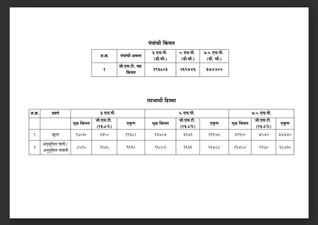 ज्या शेतकरी बांधवांची सौर कृषी पंप योजनेअंतर्गत 3HP, 5HP, आणि 7.5 HP सौर कृषी सौर पंप घेण्यासाठी निवड झाली आहे. त्या शेतकरी बांधवांसाठी सौर कृषी पंपाचे नवीन दर जाहीर करण्यात आले आहेत.